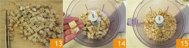 Mientras, corta el pan duro en cubitos 13, transfiérelo a una batidora 14 y tritúralo para reducirlo a migas 15.