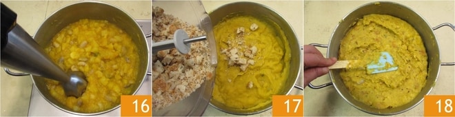 Cuando las verduras estén cocidas, apaga el fuego y tritura con una batidora de mano 16. Agrega el pan triturado a la mezcla caliente de verduras 17 y mezcla todo 18.