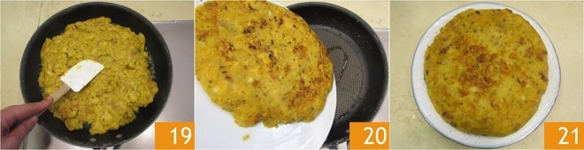 En este punto, calienta bien una sartén con un chorrito de aceite, luego vierte la mezcla dentro y aplástala para nivelar la superficie 19. Cocina durante unos minutos a fuego lento, justo el tiempo para formar una costra, luego voltea delicadamente la "tortilla" con la ayuda de un plato y deslízala de nuevo en la sartén 20; ten cuidado porque la consistencia es bastante suave. Cocina durante unos minutos también por el otro lado, después de lo cual tu tarta de pan y verduras estará lista para ser servida aún caliente 21!