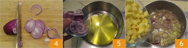 Por último, limpia la cebolla y córtala finamente 4. Vierte la cebolla en una sartén con un chorrito de aceite caliente 5, luego añade las patatas 6.