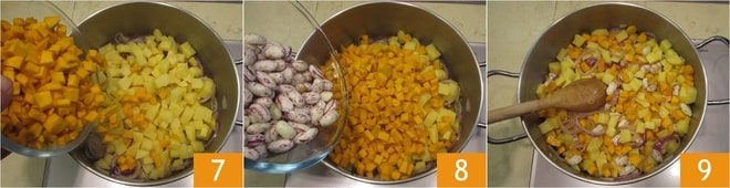 Agrega también la calabaza 7 y los frijoles 8 y mezcla durante 3-4 minutos a fuego medio 9.