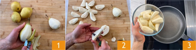 Para preparar la tarta de peras y chocolate, primero pelad las peras coscia 1, luego divididlas en 4 partes y quitad la parte central del corazón 2. Colocad los gajos en una sartén antiadherente y encended el fuego a llama alta 3.
