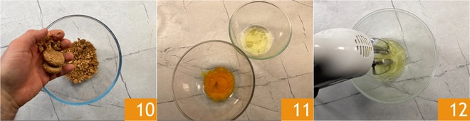 Desmenuzad los amaretti groseramente en un bol 10 y reservad. Separad las claras y las yemas en 2 boles 11: con una batidora eléctrica montad las claras durante unos minutos 12.