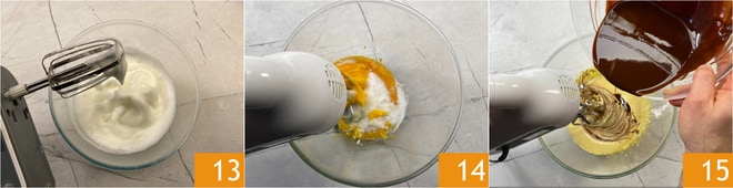 No deben montarse a punto de nieve firme, sino convertirse en una espuma suave 13. Reservad y añadid el azúcar a las yemas: con la misma batidora, montad la mezcla durante unos minutos hasta que esté clara 14. Ahora bajad la velocidad de la batidora y verted el chocolate fundido en hilo, manteniéndola siempre en acción 15.