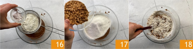 Apagad la batidora y tamizad la harina y la levadura en el bol 16. Añadid también los amaretti 17 y mezclad bien todo 18.