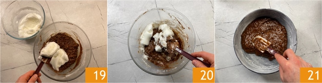 En este punto, incorporad dos tercios de las claras mezclando enérgicamente para ablandar la mezcla 19, luego añadid el tercio restante e incorporadlo mezclando más delicadamente con movimientos de abajo hacia arriba 20. Transferid la mitad de la masa a un molde de 24 cm enmantecado y enharinado, luego nivelad la superficie 21.