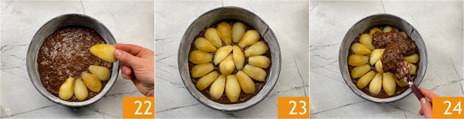 Colocad los gajos de pera con la parte abombada hacia arriba 22 disponiéndolos en forma de corona 23, luego verted la parte restante de la masa 24.