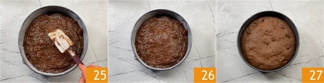 Nivelad nuevamente la superficie con la espátula 25 y hornead en horno estático precalentado a 180° durante unos 45 minutos. Haced la prueba del palillo antes de sacar la tarta: si resulta ligeramente cremosa en el interior, podéis retirarla del horno y dejar que se enfríe completamente a temperatura ambiente, de esta forma la masa evitará secarse en exceso 26. ¡La tarta de peras y chocolate está lista para ser disfrutada 27!