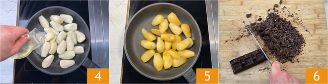 Rociad con el moscatel 4 y dejad cocinar durante unos diez minutos, dándoles la vuelta de vez en cuando: el vino debe reducirse y las peras deben dorarse; una vez listas, dejad que se templen. Mientras tanto, picad el chocolate negro 6.