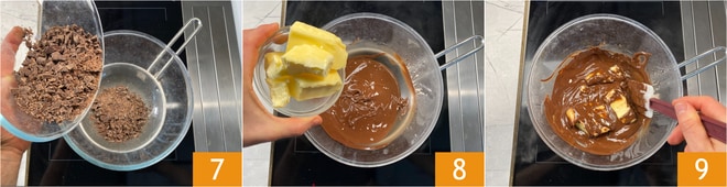 Derretid el chocolate al baño maría mezclando con una espátula 7. Una vez fundido, apagad el fuego y añadid la mantequilla a temperatura ambiente 8, removiendo continuamente para derretirla. Reservad 9.