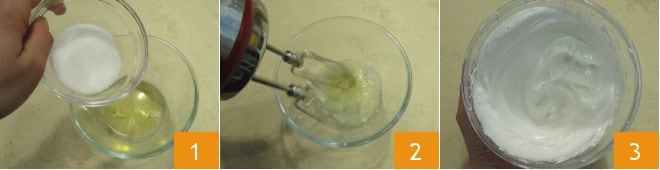 Para realizar la tarta para dos, comienza con la preparación del bizcocho de cacao: separa las yemas de las claras y colócalas en dos tazones separados. Toma el tazón con las claras, añade la mitad del azúcar 1 y trabaja con la batidora eléctrica 2 para montarlas a punto de nieve muy firme 3.