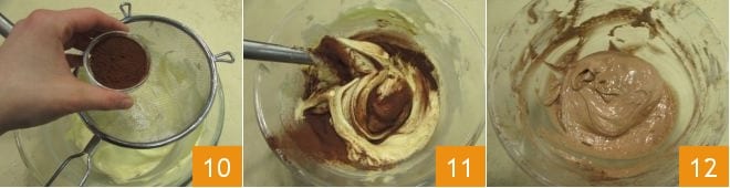 Incorpora los ingredientes secos a la mezcla de huevos con la espátula, haciendo siempre movimientos delicados de abajo hacia arriba, luego tamiza también el cacao en polvo 10 y mezcla nuevamente para incorporarlo 11 hasta que obtengas una mezcla homogénea, espumosa y sin grumos 12.