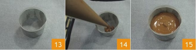 Precalienta el horno a 175° en modo estático, luego forra una bandeja de horno con papel sulfurizado. Toma un aro de molde de 9 cm de diámetro, de aproximadamente 6 cm de altura, y fórralo por dentro con una tira de papel sulfurizado, asegurándote de que sobresalga del borde aproximadamente medio cm 13. Transfiere la mezcla del bizcocho en una manga pastelera, coloca el aro en la bandeja forrada y llénalo con la mezcla 14 hasta aproximadamente 1 cm del borde 15. Hornea en el horno estático precalentado a 175°, en la bandeja más baja, durante unos 35 minutos.