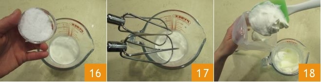 Mientras el bizcocho está en el horno, puedes montar la nata para la decoración: une la nata líquida y el azúcar en un recipiente 16 y monta con una batidora eléctrica 17 hasta que esté bien firme, luego transfiérela a una manga pastelera equipada con una boquilla mediana (lisa o en forma de flor) 18 y ponla en el frigorífico, para que esté bien fría cuando la utilices para decorar la tarta.
