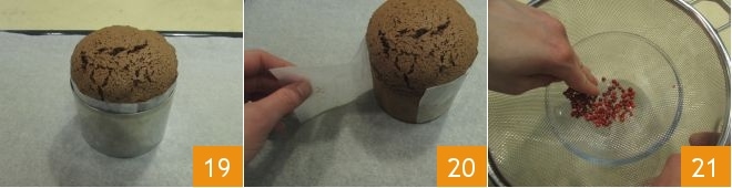 Transcurrido el tiempo de cocción del bizcocho (verifica con un palillo que esté cocido por dentro), déjalo templar dentro del aro 19, luego desmóldalo y retira delicadamente el revestimiento de papel sulfurizado 20. Deja enfriar completamente el bizcocho, mientras tanto pasa a la preparación de la crema: coloca los granos de pimienta rosa dentro de un tamiz, colócalo sobre un tazón y frótalos con la punta de los dedos para desgranarlos; de esta manera, la cáscara externa de los granos de pimienta quedará en el tamiz, mientras que en el tazón se recogerá un polvo que se utilizará para la crema 21.