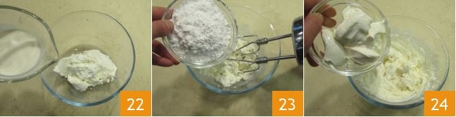 Coloca la ricotta en un tazón aparte, añade la nata líquida 22 y mezcla brevemente con las varillas eléctricas, luego añade el azúcar glas 23 y continúa trabajando con la batidora para mezclar bien todos los ingredientes. Añade el mascarpone 24 y trabaja de nuevo la crema con las varillas eléctricas.
