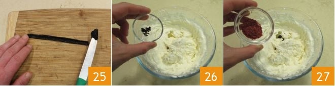 Ahora extrae las semillas de la vaina de vainilla usando un cuchillo de hoja lisa 25, luego añádelas a la crema de ricotta y mascarpone 26, junto con el polvo de pimienta rosa que obtuviste anteriormente 27.
