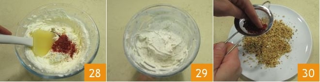 Mezcla delicadamente con una espátula para incorporar todos los ingredientes 28 y obtener una crema lisa y homogénea 29, luego transfiere la crema obtenida a una manga pastelera equipada con una boquilla lisa estriada y guárdala en el frigorífico. Finalmente, vierte el granillo de avellanas en un plato y mézclalo con el polvo de pimienta rosa, tamizándolo con el mismo método explicado anteriormente 30, y resérvalo.