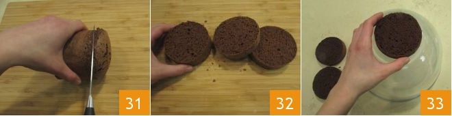 En este punto, el bizcocho se habrá enfriado, así que colócalo sobre una tabla de cortar y retira la tapa con un cuchillo de hoja dentada 31; el pastelillo de esta manera medirá unos 6 cm de altura, así que córtalo horizontalmente en 3 partes, obteniendo 3 discos de 2 cm de grosor cada uno 32. Es el momento de ensamblar la tarta: si no tienes un soporte giratorio para tartas, puedes utilizar un tazón bastante grande invertido sobre la superficie de trabajo. Coloca la base del bizcocho sobre el tazón invertido 33