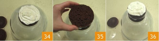 y rellena la superficie con la crema de ricotta que habías puesto en la manga pastelera 34. Añade el segundo disco de bizcocho 35 y rellena también este con la crema de ricotta 36, luego cubre todo con la última capa de bizcocho, sin rellenarla.