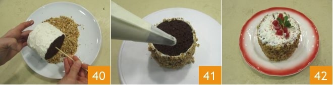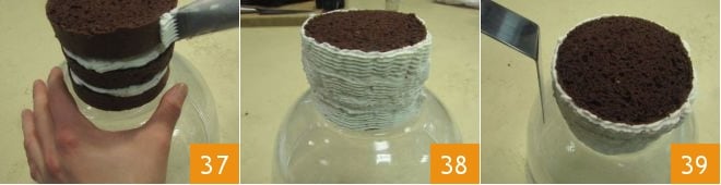 Ahora pasa a cubrir la tarta: apoya la boquilla de la manga pastelera en el lado exterior aplicando una ligera presión y simultáneamente gira el tazón 37 para cubrir uniformemente la superficie lateral de la tarta 38. Finalmente, usa una espátula para alisar la superficie, ayudándote girando el tazón que sirve de base y mojando la espátula de vez en cuando con un poco de agua 39.