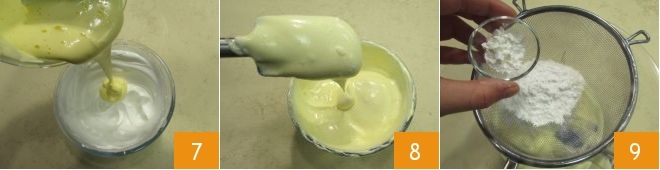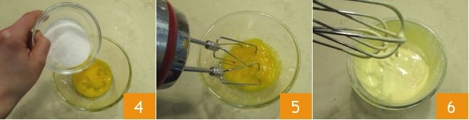 Ahora toma el tazón con las yemas, añade la otra mitad del azúcar 4 y trabaja con la batidora eléctrica 5 hasta que se vuelvan claras y espumosas 6.