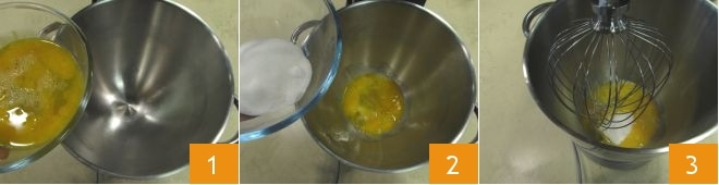 Para preparar la tarta de ricotta y peras, comienza derritiendo 75 g de mantequilla a fuego muy suave y déjala templar. Mientras tanto, vierte los huevos en una batidora con varillas 1, añade el azúcar 2, 1/3 de las semillas de la vaina de vainilla y comienza a batir a velocidad moderada 3; bate durante unos 10 minutos.