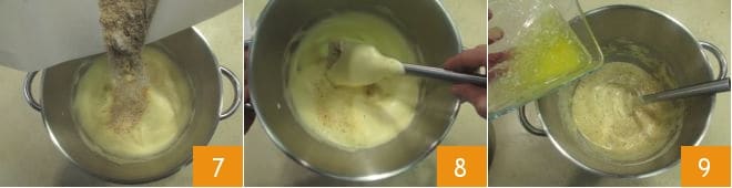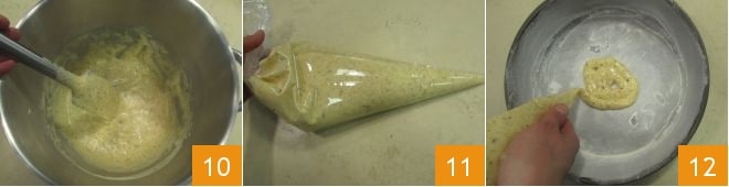 Mezcla de abajo hacia arriba para incorporarla 10, luego vierte la mezcla obtenida en una manga pastelera con boquilla lisa 11. Precalienta el horno a 205° en modo estático. Unta con mantequilla y harina dos moldes de 22 cm de diámetro, luego crea una capa de masa en el fondo, comenzando desde el centro con un movimiento en espiral 12