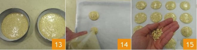 y expandiéndote poco a poco por toda la superficie: así obtendrás dos bases perfectas 13. En este punto, con la masa restante, puedes hacer unas galletas que servirán para la decoración final de la tarta: coloca una hoja de papel de horno en una bandeja, luego comienza a formar discos con la masa sobrante, distanciándolos unos centímetros para que no se peguen durante la cocción 14. Saldrán unas veinte. Espolvoréalos con el granillo de avellanas 15.
