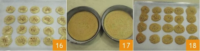 Ahora también tienes las galletas listas 16. Las bases deben cocinarse en horno estático precalentado a 205° durante 13 minutos; las galletas solo durante 6 minutos. Una vez listas (17-18), déjalas reposar para que se enfríen completamente.