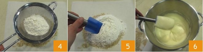 En una hoja de papel de horno, transfiere la harina de avellanas de Giffoni, tamiza encima la harina 00 4 y mezcla con una espátula para combinarlas 5. Cuando hayas obtenido una mezcla de huevos y azúcar bien montada, clara y espumosa 6,
