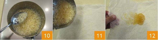 y deja hervir a fuego lento hasta obtener un caramelo rubio. Toma una hoja de papel de horno y arrúgala; cuando el caramelo esté listo 10, vierte una pequeña parte sobre el papel de horno arrugado 11 y deja que se extienda para crear una base irregular 12.
