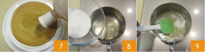 humedece nuevamente con el jarabe 7 y coloca en el congelador durante al menos 2 horas. Cuando esté bien sólida, podrás preparar las decoraciones: en un cazo vierte agua, miel y azúcar 8. Mezcla 9