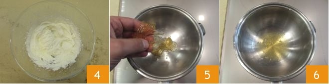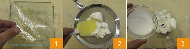 Coloca la gelatina en hojas en un bol con agua fría 1. Mientras tanto, toma la ricotta de búfala y vaca y déjalas escurrir del suero (toda la noche si es necesario), pásalas por un colador 2, luego añade las semillas de la vainilla reservadas y 80 g de azúcar 3.