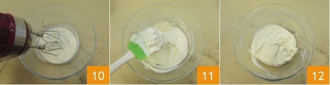 Montar la nata y el azúcar con las varillas de una batidora eléctrica perfectamente limpias 10. Luego añade la nata a la crema de ricotta, primero una espátula mezclando enérgicamente 11, luego el resto, mezclando delicadamente de arriba hacia abajo para no desmontar la nata. Obtendrás así tu crema suave y aterciopelada 12. Puedes ponerla en una manga pastelera desechable con boquilla lisa.