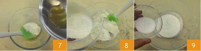 Toma un poco de crema de ricotta y en un pequeño bol agrégala junto con la gelatina ya derretida 7, mezcla y luego vierte todo sobre el resto de la crema de ricotta 8. Mezcla bien todo. En otro bol, vierte la nata fresca líquida (la temperatura debe ser de aproximadamente 4°) y los 12 g restantes de azúcar 9.