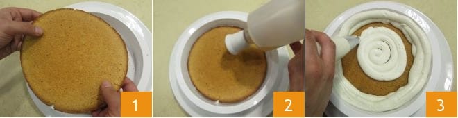 Ahora puedes pasar a la composición y decoración de la tarta de ricotta y peras: toma un disco de acetato de 22 cm (como el diámetro de las dos bases). Colócalo sobre un plato para servir y coloca dentro uno de los discos 1. Humedece con el jarabe de peras 2, luego crea una capa de crema distribuyéndola con la manga pastelera, primero con un par de vueltas en el borde, las otras en el centro 3.
