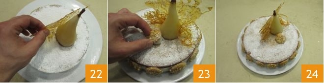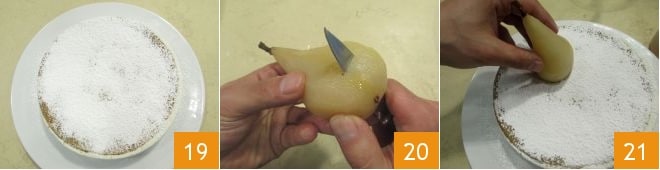 Espolvorea la tarta con azúcar glas, luego corta la base de la pera entera 20 y coloca la pera sobre la tarta 21.