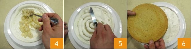 Distribuye las peras cocidas 4, luego otra vuelta de crema de ricotta y extiende para uniformar la capa 5. Coloca el otro disco para cubrir 6,