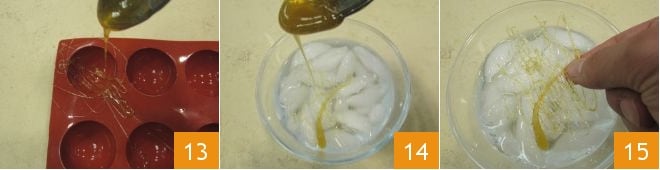 Deja reposar durante 1-2 minutos el caramelo restante, para que espese, y crea una decoración en forma de cúpula distribuyendo hilos de caramelo sobre un molde de silicona de esferas 13. Luego vierte la parte restante en hilo en un bol con agua fría y hielo 14 para que, al solidificarse, se creen otras decoraciones 15.