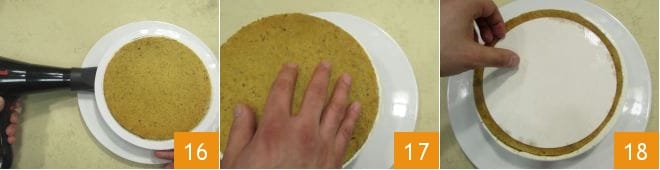 Después de 2 horas, saca la tarta de ricotta y peras del frigorífico: para quitar más fácilmente el disco de acetato, puedes calentar con un secador el borde externo 16, luego voltea la tarta 17 y retira tanto el borde como la base 18.