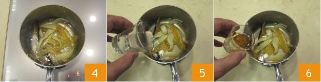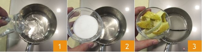 Vierte el agua en un cazo 1 junto con el azúcar 2, la vaina de vainilla sin las semillas (que reservarás) y las cáscaras de las peras 3.
