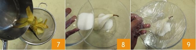Mezcla, luego podrás colarlo 7, así tendrás listo el jarabe para mojar las bases de la tarta. En un bol, coloca una pera entera pelada (dejando el tallo) y cúbrela con azúcar 8, gira el bol para que el azúcar se distribuya sobre la pera. Luego cubre con film 9 y coloca en la nevera durante al menos 1 hora. Después, pásala al microondas durante 4 minutos a máxima potencia.