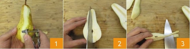 Lava y pela las peras con un pelador de verduras (guarda las cáscaras porque las necesitarás después) 1; divide las peras a la mitad 2, quita el corazón 3