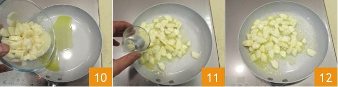 En una sartén amplia, vierte un chorrito de aceite de oliva virgen extra y deja que se caliente; agrega los dados de pera 10 y mezcla. Cocina por unos minutos, luego agrega un poco de agua y aromatiza con las semillas de 1/3 de vaina de vainilla; cocina unos instantes más, mezclando de vez en cuando y rocía con el destilado de peras 11. Las peras deben quedar crujientes. Vierte las peras cocidas, aún calientes, en un bol, recuperando bien el jugo, y cubre con film transparente. Deja enfriar y mientras tanto prepara el jarabe de peras.