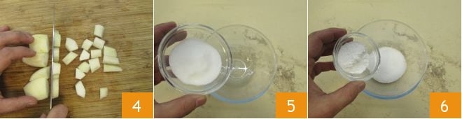 y córtalas en dados 4. Coloca los dados de pera en un bol; en otro, vierte el azúcar 5 y el almidón 6, mézclalos juntos