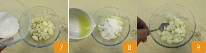 antes de verter la mezcla sobre los dados de pera 7. Luego añade el jugo de limón 8 y mezcla cuidadosamente 9.