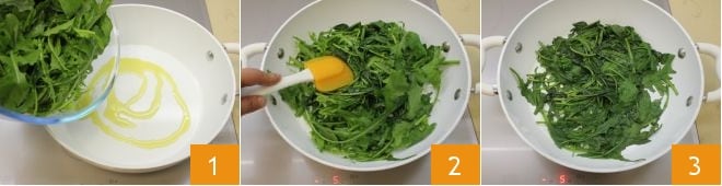 Para preparar las tartaletas de enkir con patatas y achicoria empieza haciendo la masa brisa con harina de enkir y achicoria silvestre. Primero cocina la achicoria silvestre en una sartén con un poco de aceite 1, durante pocos minutos y removiendo de vez en cuando 2, hasta que esté marchita, pero no completamente seca 3. Luego déjala enfriar completamente.
