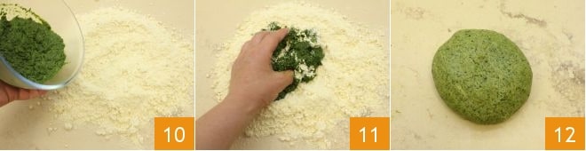 Luego vierte el compuesto arenoso sobre una superficie y añade la crema de achicoria 10. Comienza a amasar con las manos 11 hasta obtener una masa suave y compacta 12. Envuélvela en film transparente y deja que se solidifique en el frigorífico durante unos 30 minutos.