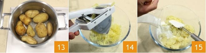 Mientras tanto comienza a preparar el relleno para las tartaletas de enkir. Hierve las patatas en abundante agua 13, pélalas y aplástalas aún calientes dentro de un bol 14. Añade poco a poco la leche, que habrás entibiado ligeramente 15, y mezcla con una cuchara de madera hasta obtener un compuesto suave.